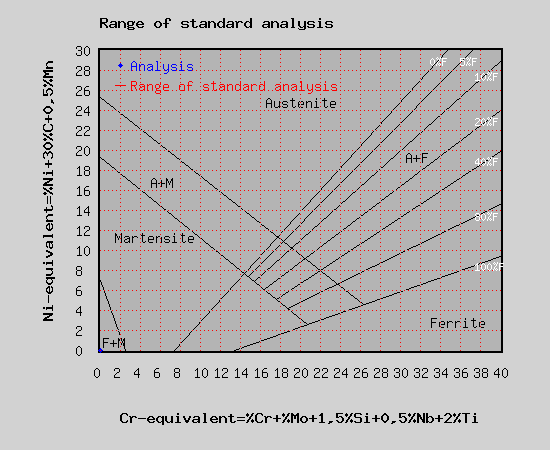 After entering the range of the standard analysis and the actual analysis the Ni-equivalent and the Cr-equivalent are calculated and shown in a diagram.
