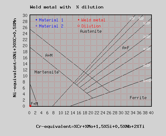 Après la saisie des différents matériaux à souder et l'analyse et l'analyse du métal fondu, les équivalents chrome et nickel sont calculés et affichés dans un diagramme.
