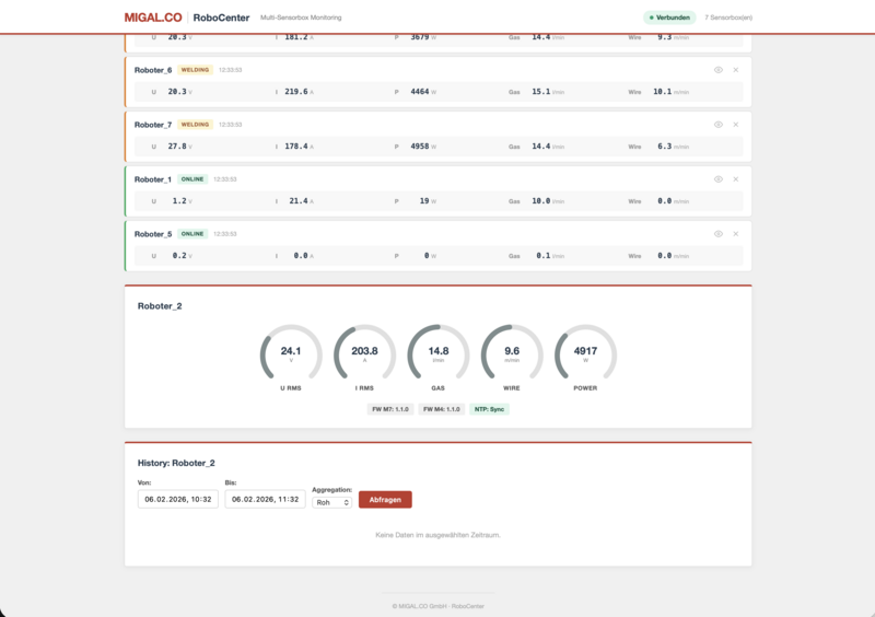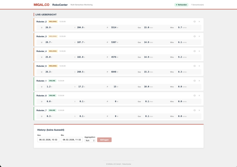 RoboCenter ist die zentrale Monitoring-Plattform fuer MIGAL.CO Sensorboxen und netzwerkfähige Schweißanlagen (MQTT) anderer Hersteller. Ueberwachen Sie Spannung, Strom, Leistung, Schutzgasdurchfluss und Drahtvorschub aller Ihrer Schweissanlagen in Echtzeit -- von jedem Arbeitsplatz, aus dem Buero oder mobil.