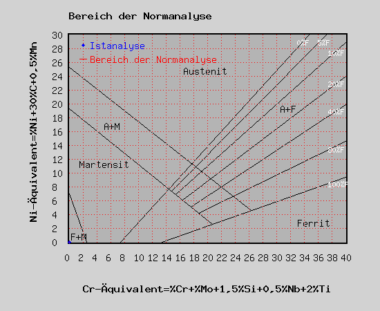 Nach Eingabe des Bereiches der Normanalyse und der Ist-Analyse des Werkstücks, werden die Chrom- und Nickel-Äquivalente berechnet und in einem Diagramm ausgegeben.