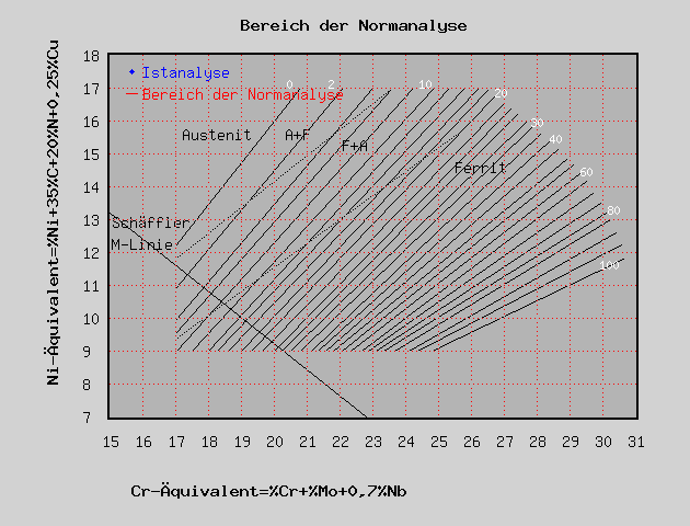 Nach Eingabe des Bereiches der Normanalyse und der Ist-Analyse des Werkstücks, werden die Chrom- und Nickel-Äquivalente berechnet und in einem Diagramm ausgegeben.